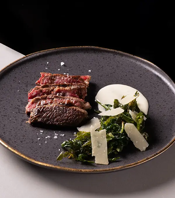 Tagliata con rucola fritta, aceto Boreale e scaglie di parmigiano.