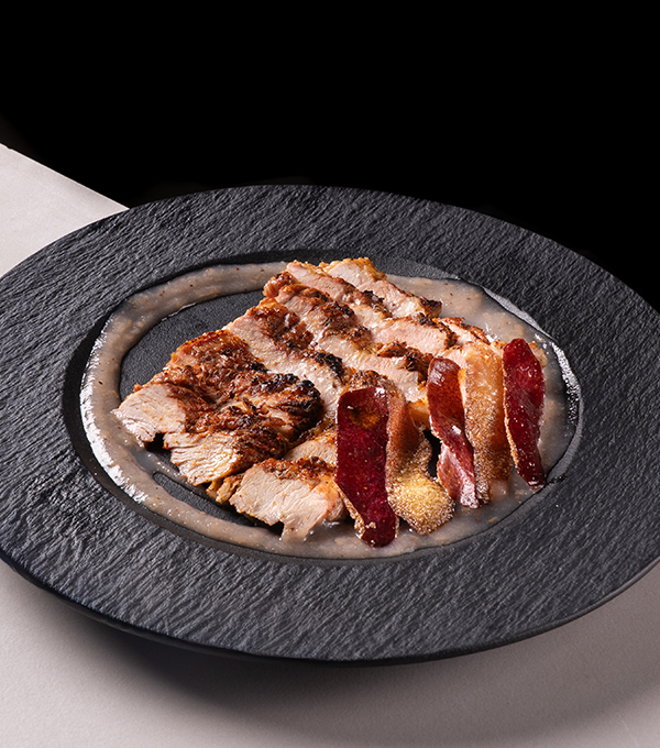 Capocollo su fondo di teriyaki e miele e chutney di mela.