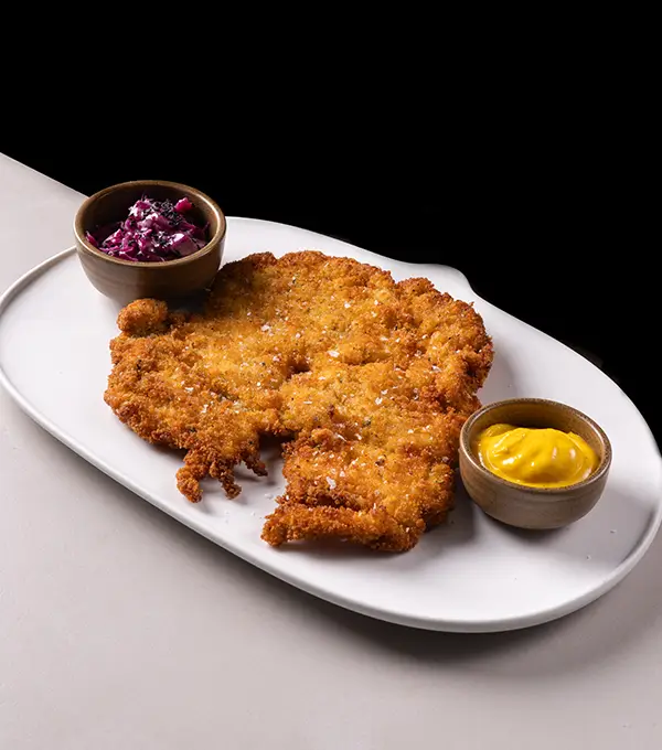 Pollo marinato in yogurt e spezie, panato in pane panko, rosmarino e cocco. Servito con coleslaw di verdure croccanti, sesamo, lime e miele.