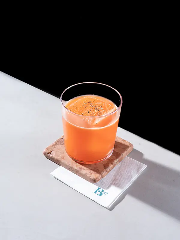Un Bloody Mary in twist sudamericano: Campari, rum agricolo e mezcal, addolciti dall’agave e bilanciati dal lime, con succo di carota, sale e pepe per una chiusura vegetale e speziata.