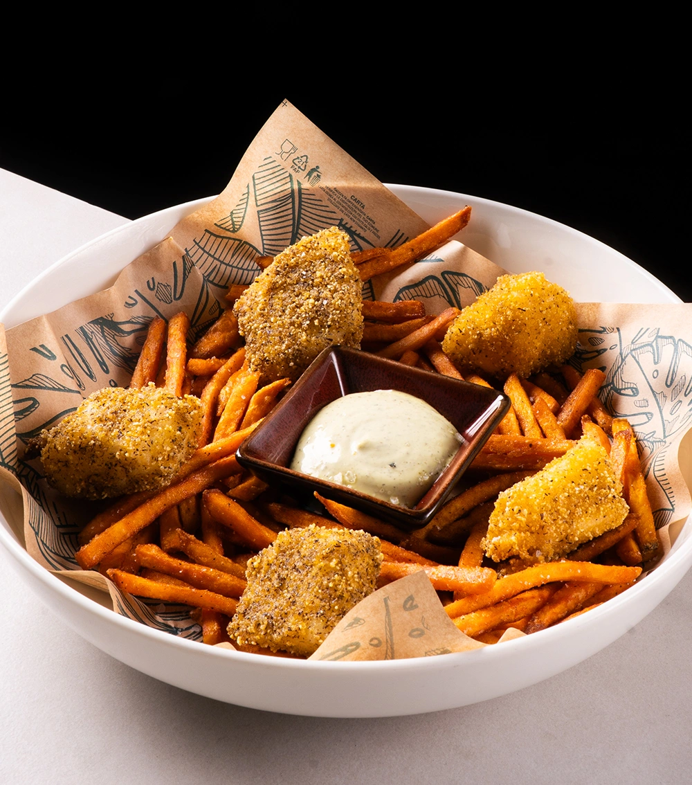 Mix di croccanti fritture di mare e terra con Baccalà impanato e Patate Arancioni. Accompagnato da mayo alla erbe.