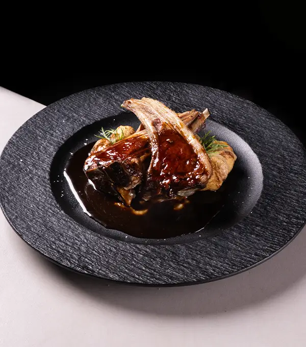 Carré di agnello rosolato con carota, sedano, cipolla e vino bianco. Accompagnato da carciofi, patate arrosto, e rosmarino.