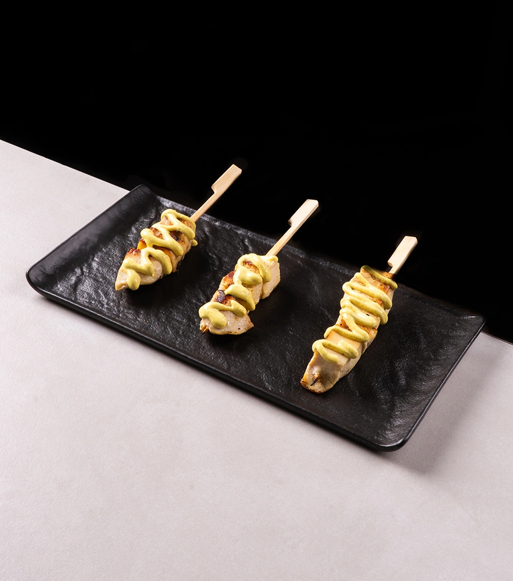 Delicati spiedini di gamberi scottati, accompagnati da un gel fresco e agrumato allo Yuzu. Ogni boccone è un’esplosione di sapori marini bilanciati dalla vivacità esotica degli agrumi, per un’esperienza unica che unisce leggerezza e intensità.