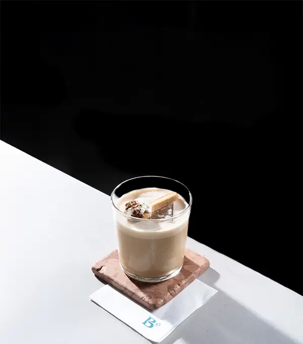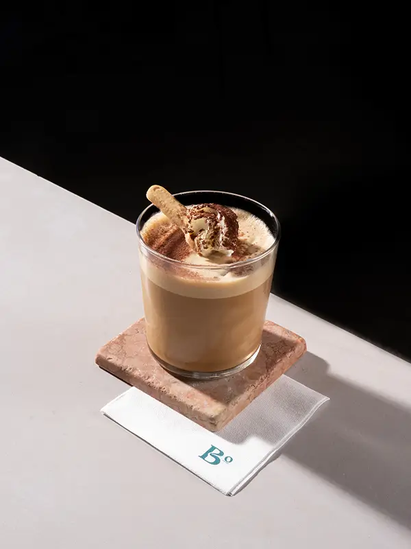 Versione cremosa dell’Irish Coffee con variante al cioccolato. Espresso e Whiskey si fondono con panna fresca e miele, chiusi da un tocco di bitter al cioccolato.