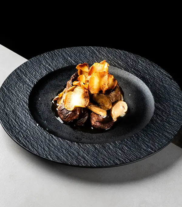 Filetto glassato con topinambur in doppia consistenza. Completato da mix di funghi shiitake e champignon.