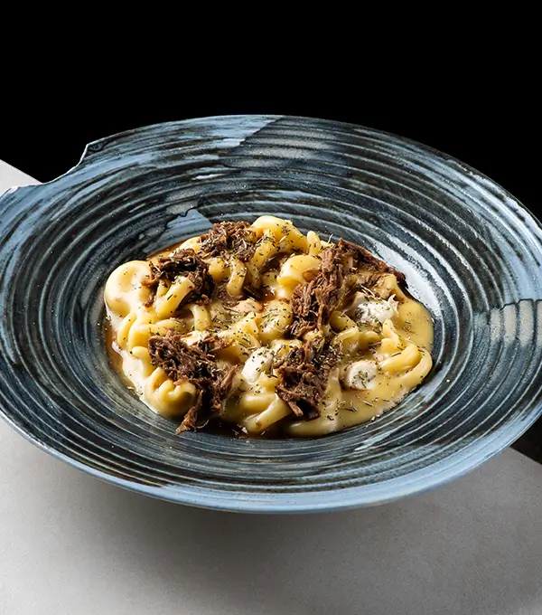 Pasta Vesuvio con patate, ossobuco e carne sfilacciata di brasato. Rifinita con una chiusura di provola affumicata a tocchetti e polvere di rosmarino.
