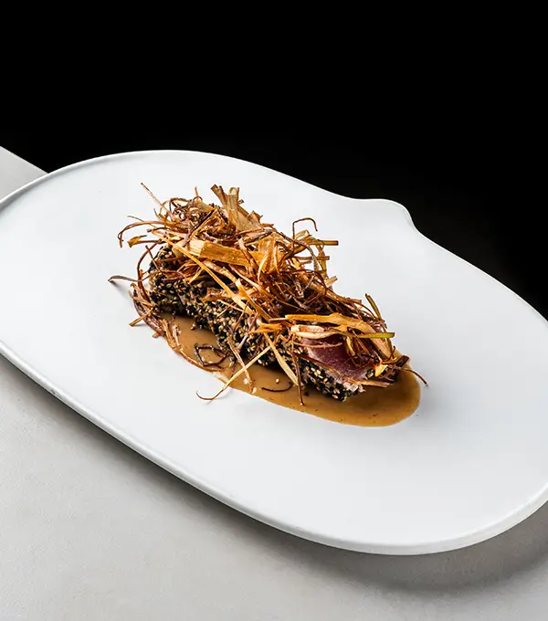 Tataki di tonno in salsa tahina con porro croccante e gel ponzu.